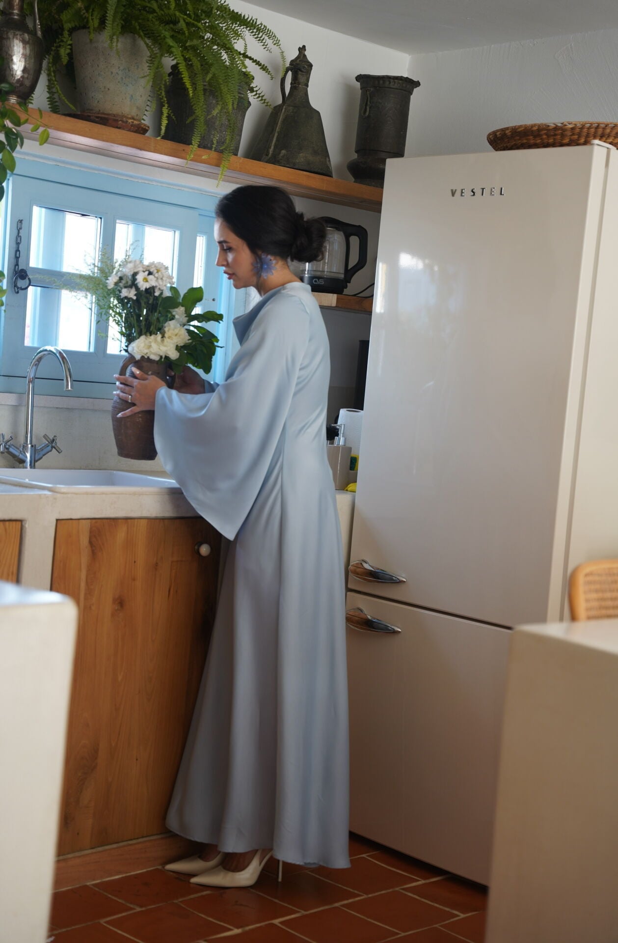 • Tasarım: Geniş çan kolları ve dökümlü yaka detayıyla zarif, akıcı bir siluet oluşturur.