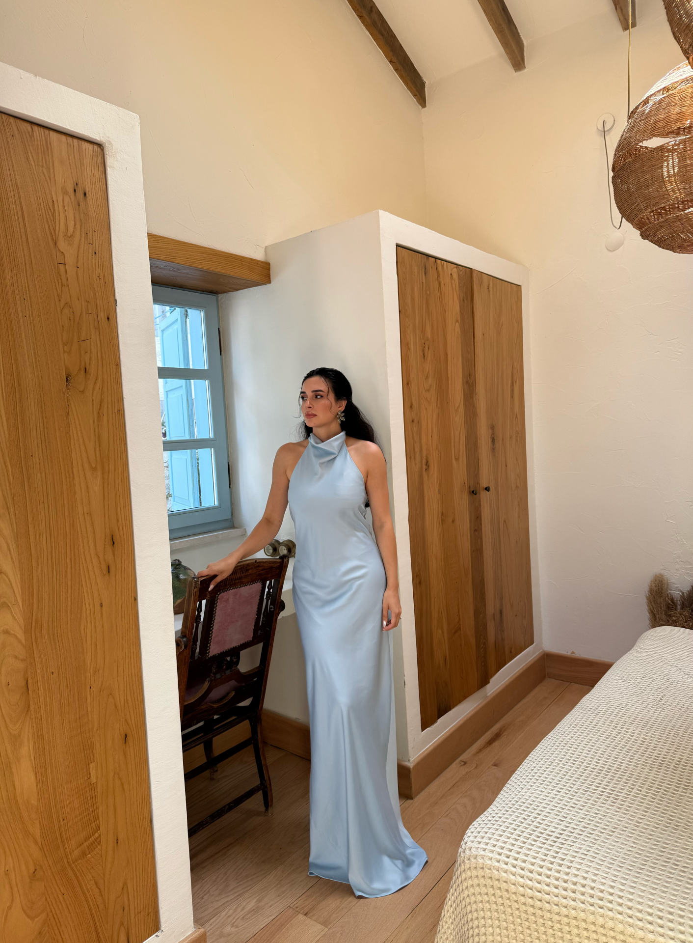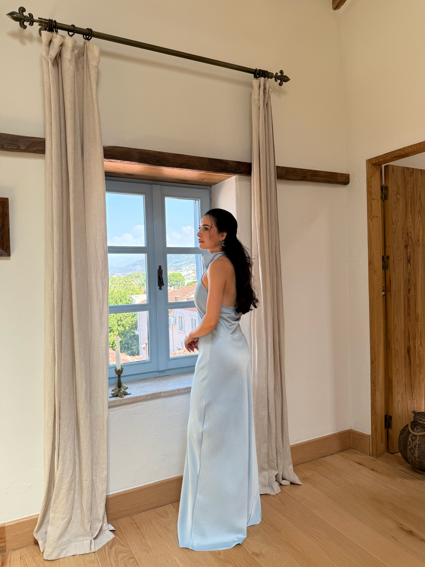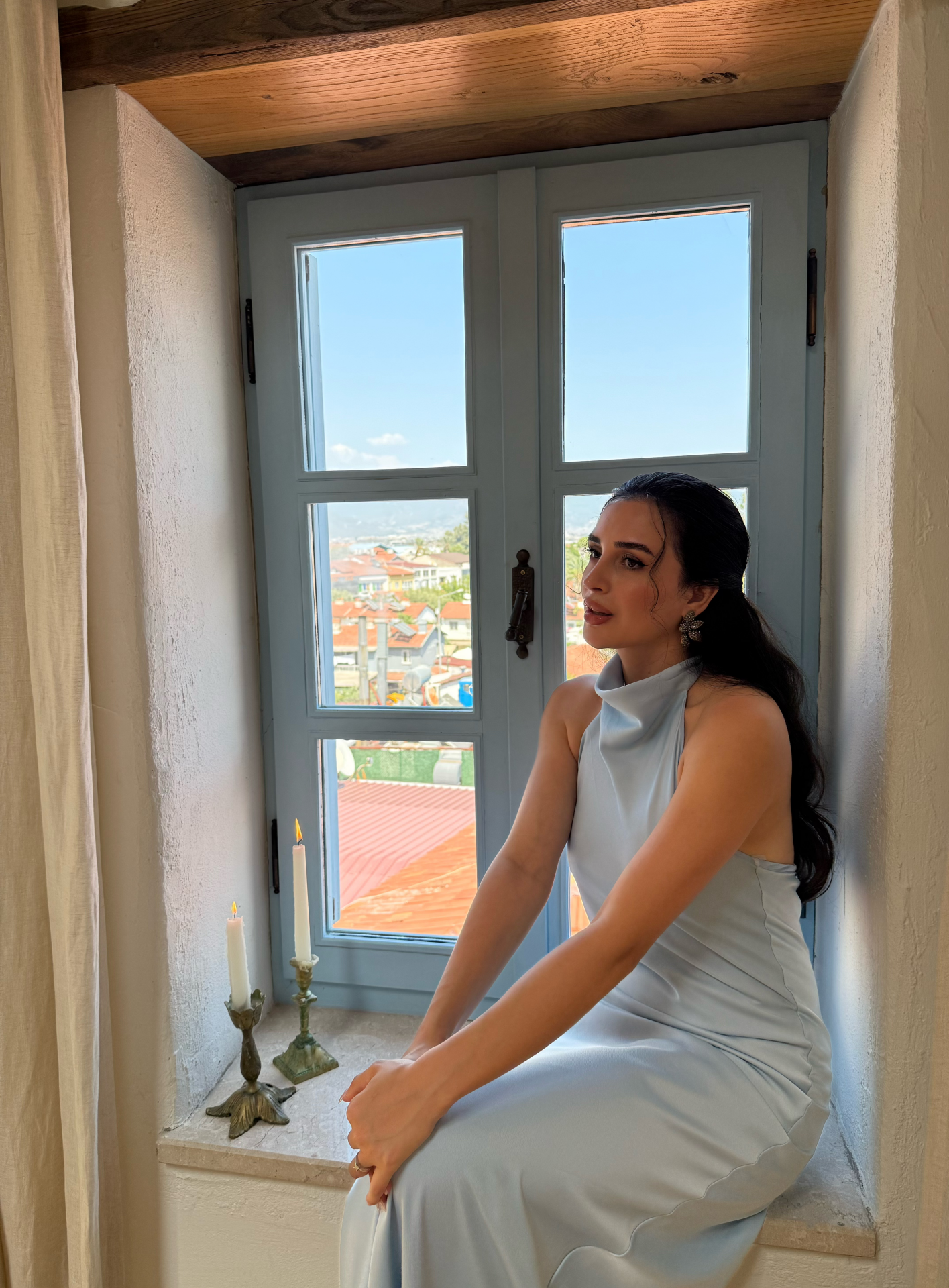 Zamansız şıklığın modern yorumunu sunan buz mavisi ve siyah drapeli halter yaka saten maxi elbise, sofistike tarzıyla özel davetlerin en göz alıcı parçalarından biri. Akışkan ve hafif saten dokulu kumaşı sayesinde vücuda zarifçe otururken, dökümlü yapısıyla konfor ve şıklığı bir arada sunar.