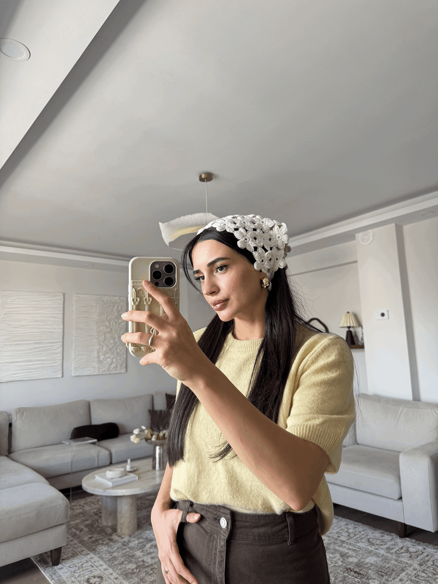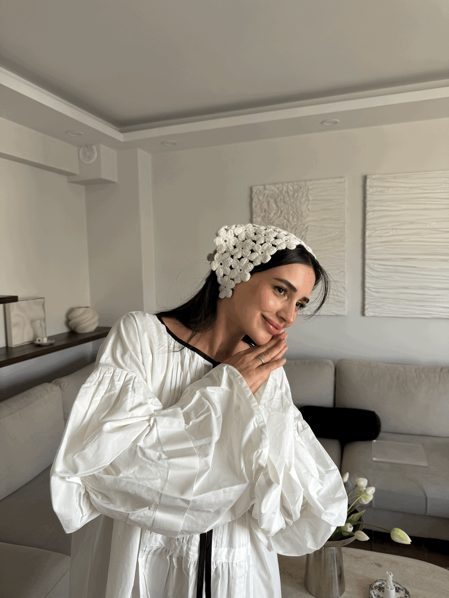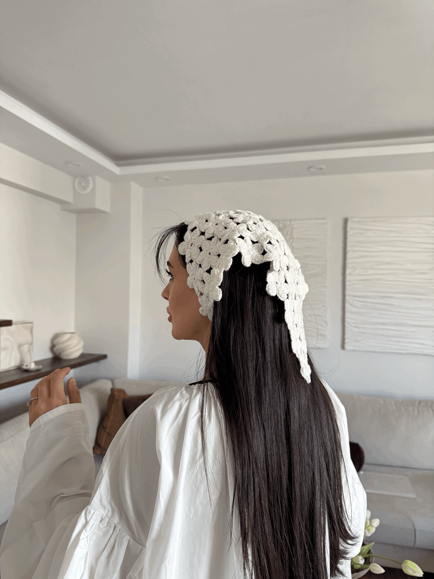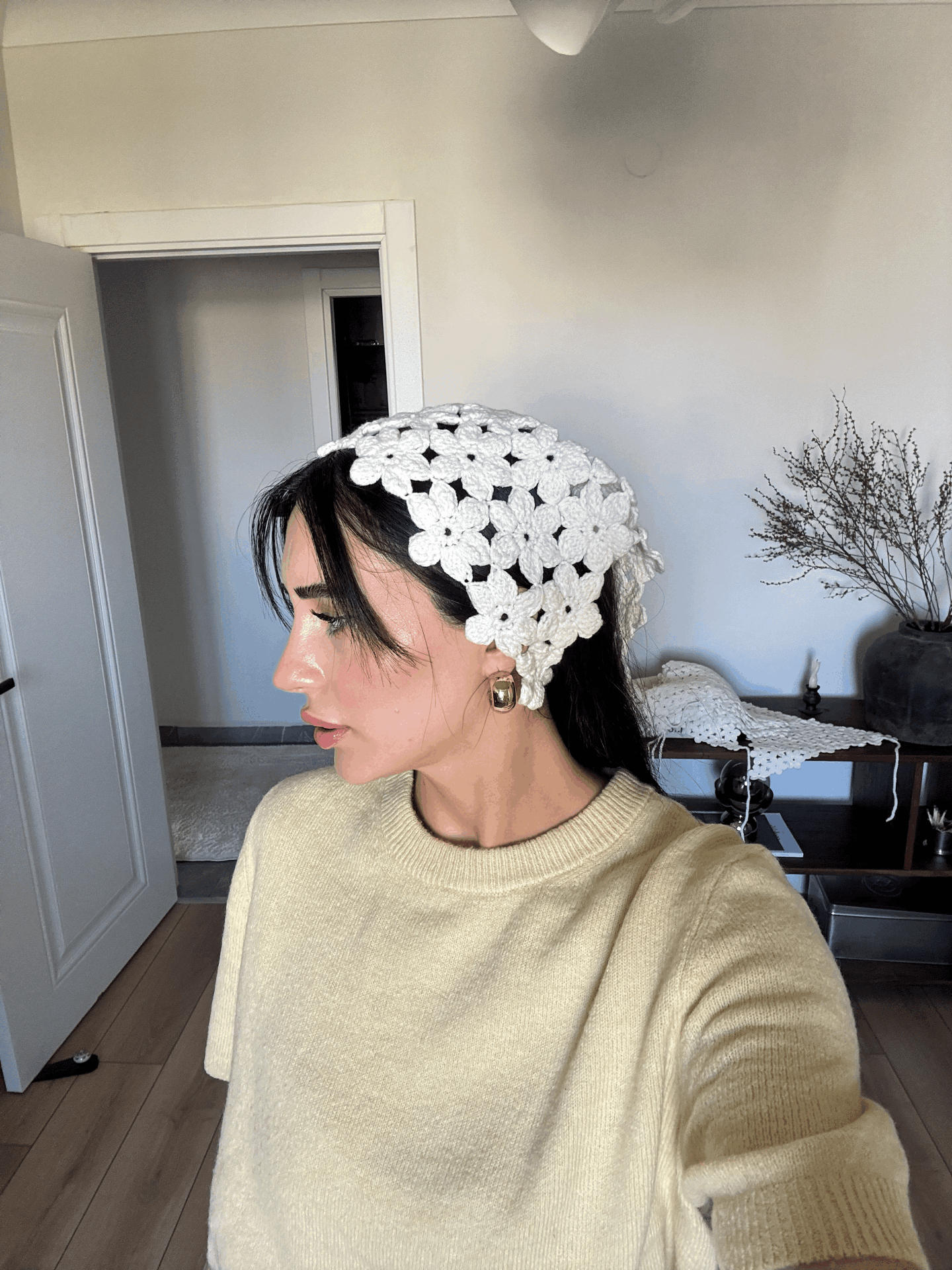 Ekru çiçekli bandana standart beden
