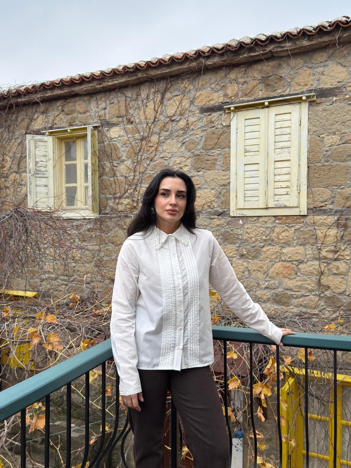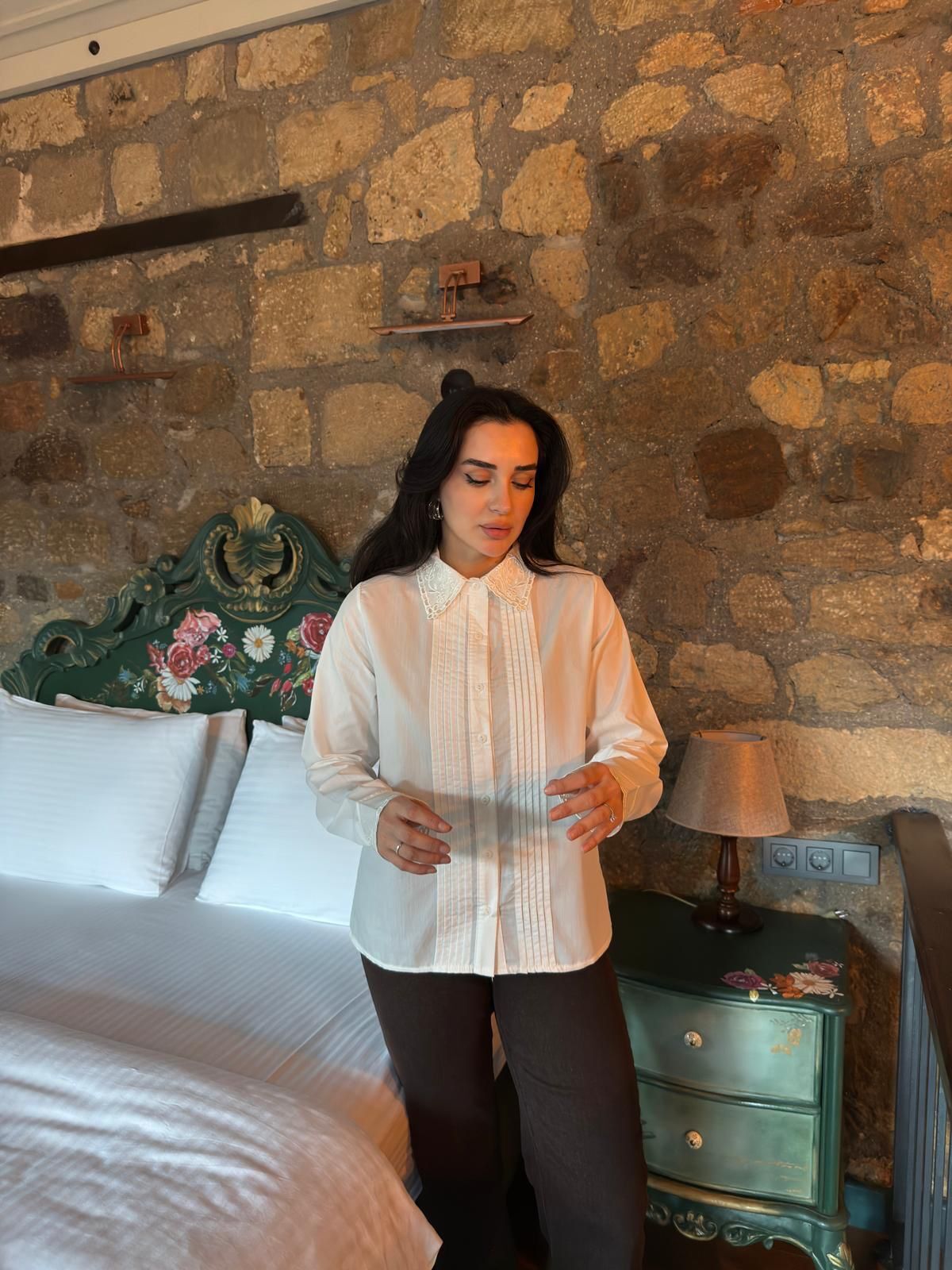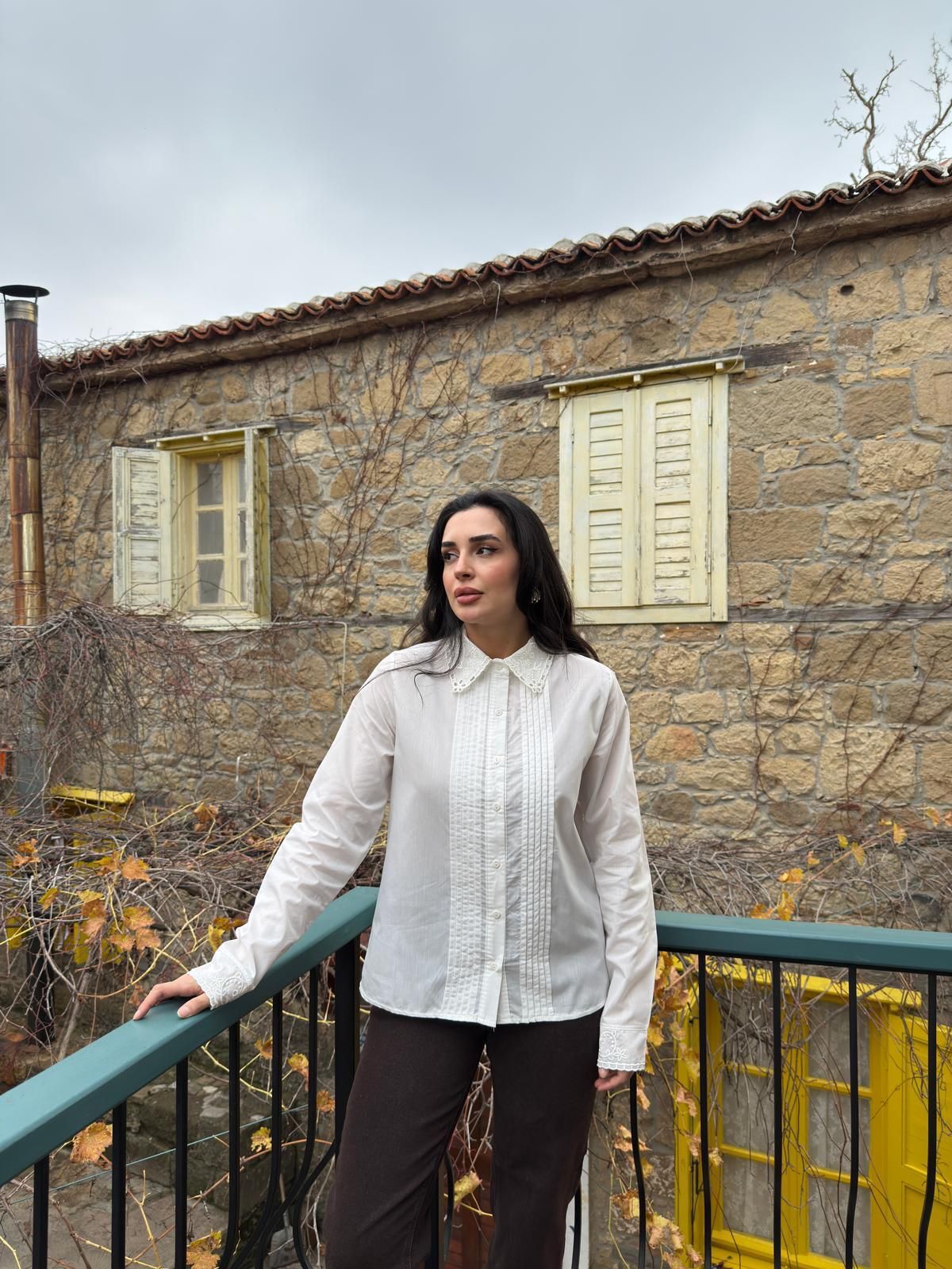 Liore Élise Gömlek, dantel yaka ve manşet detaylarıyla klasik beyaz gömleğe romantik ve sofistike bir dokunuş katıyor. Ön pilise tasarımı gömleğe zarif bir form kazandırırken, sade çizgileri sayesinde hem günlük kombinlerde hem de özel anlarda rahatlıkla tercih edilebilir.