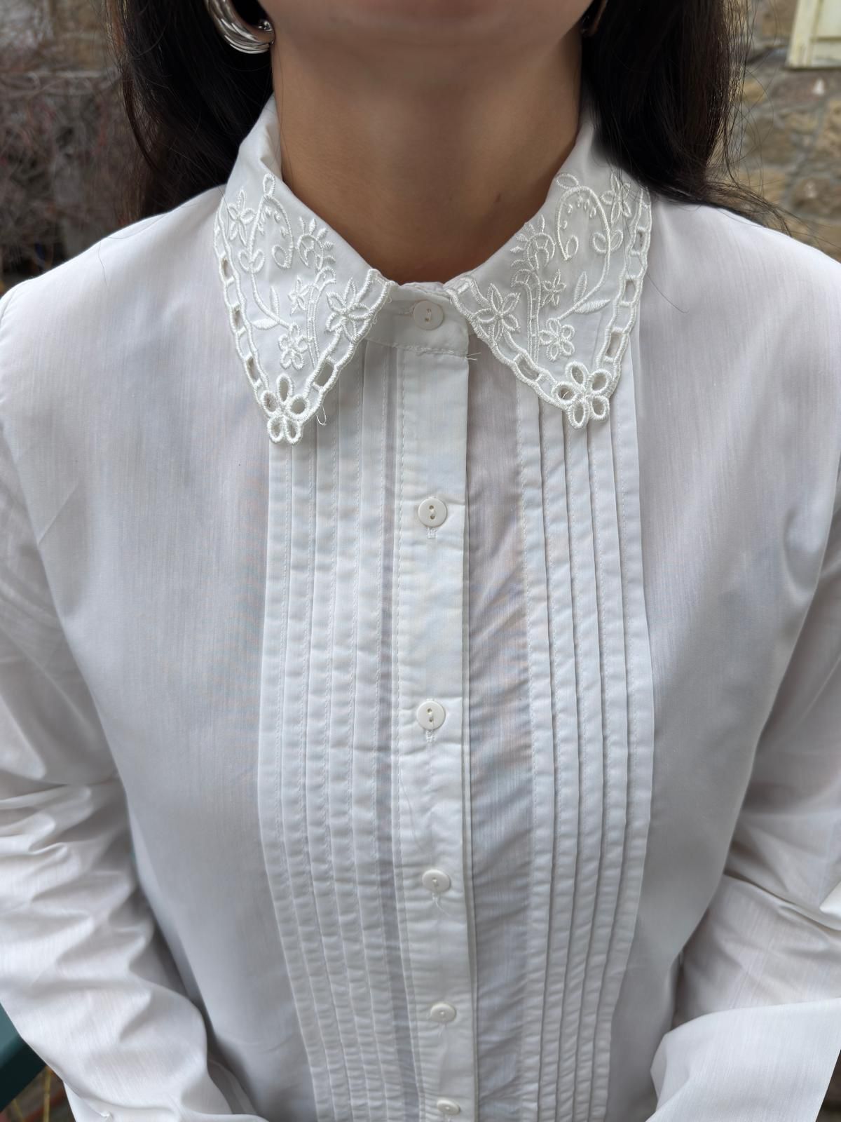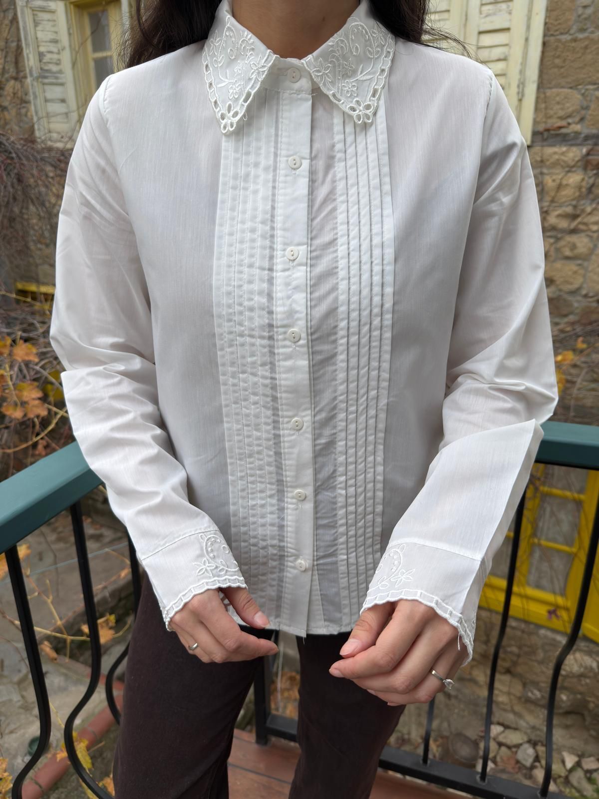 İşleme detay ve önü piliseli gömlek L - Beyaz