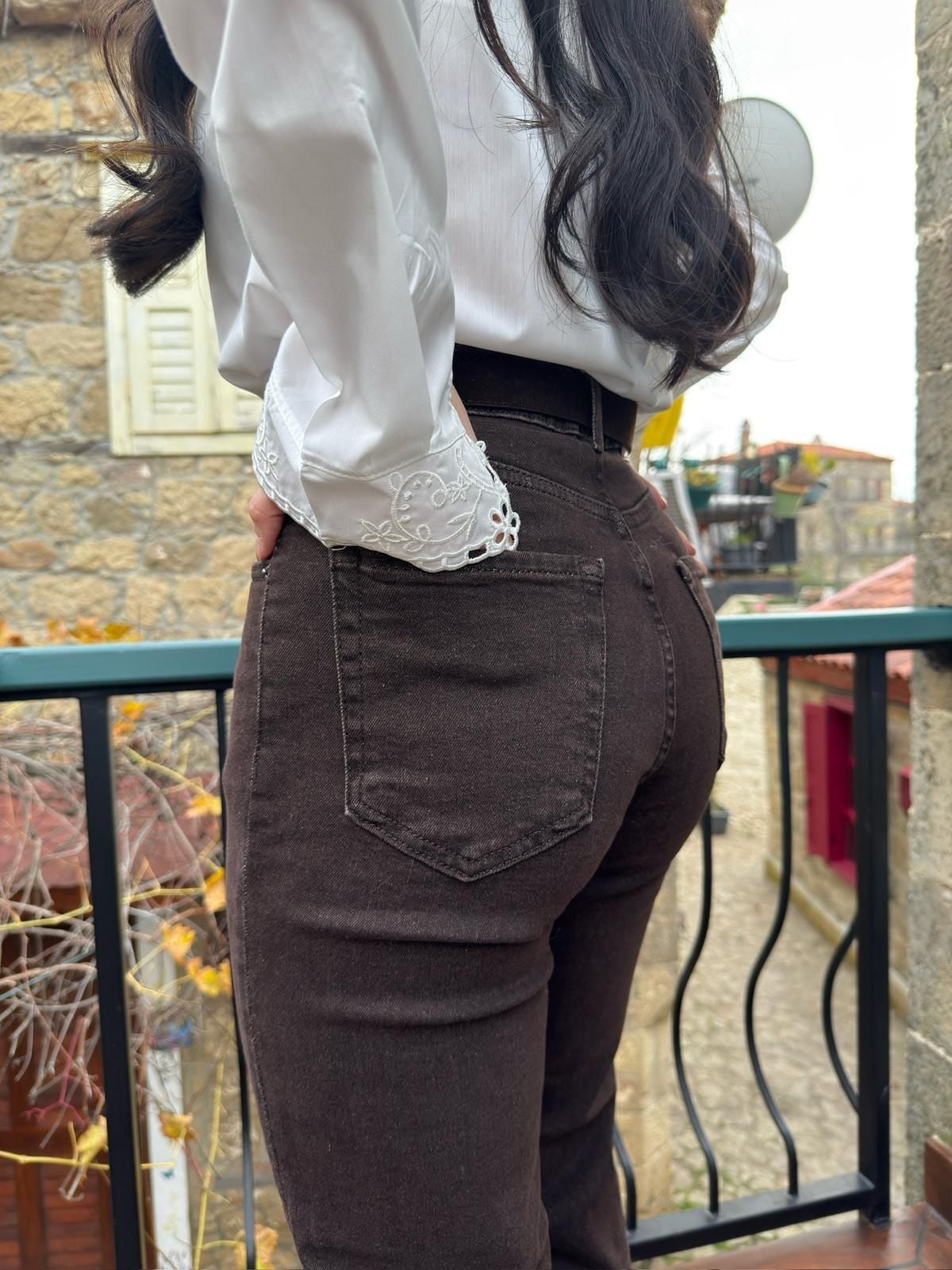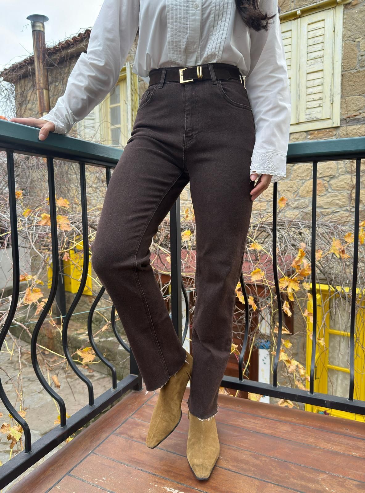 Kemerli kesik paça likralı jean 36 - Kahverengi