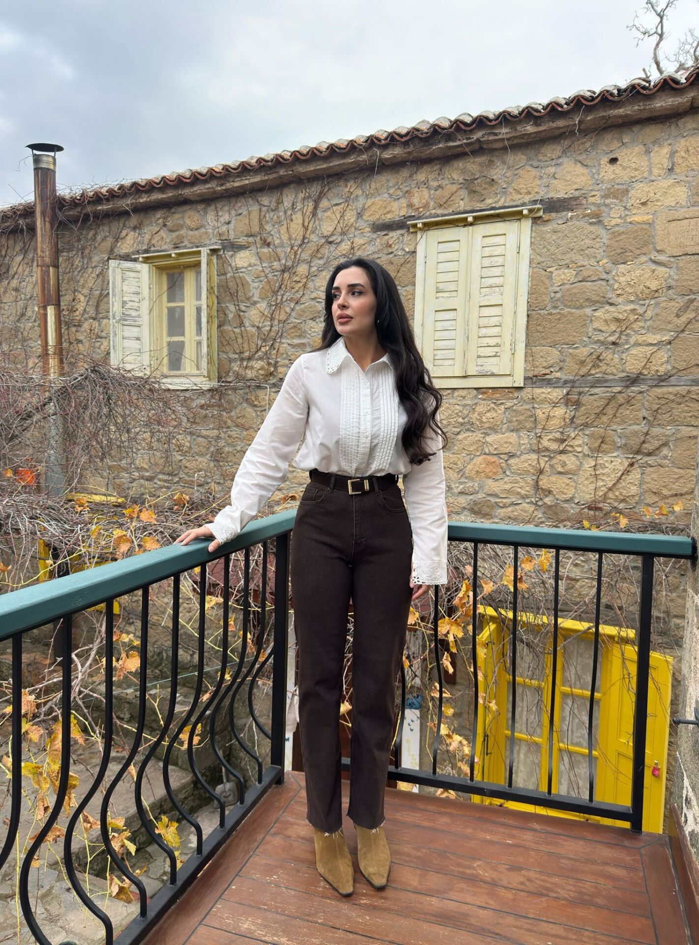 Kemerli kesik paça likralı jean Kahverengi - 34