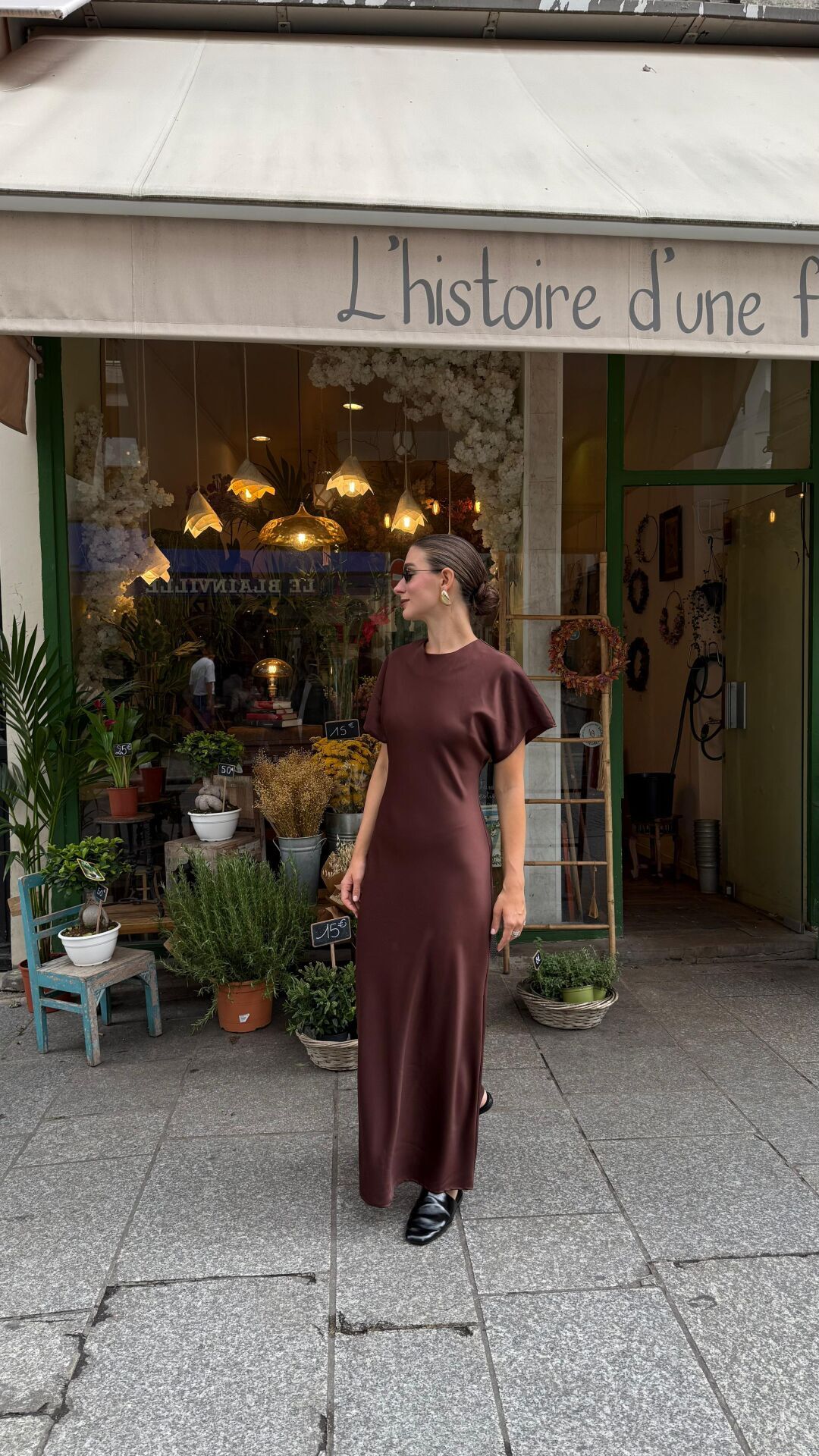Kısa kol vücuda oturan saten elbise Kahverengi - S