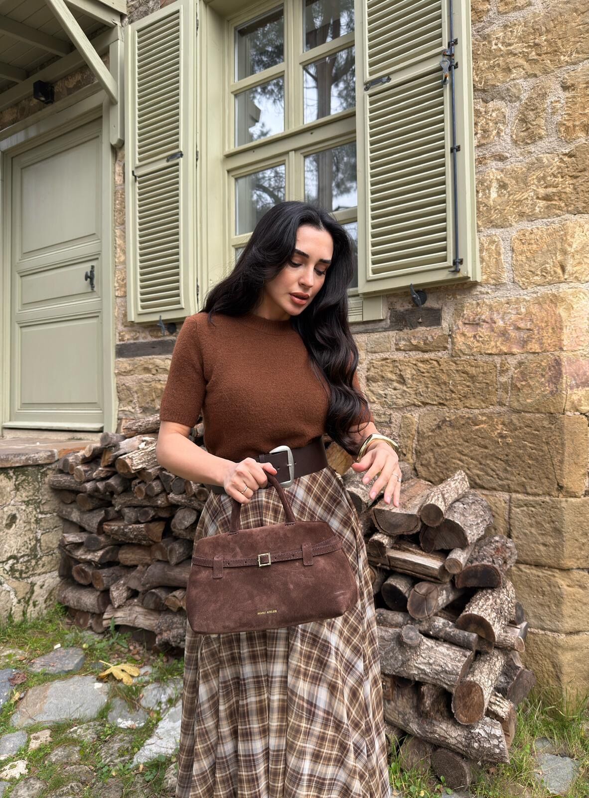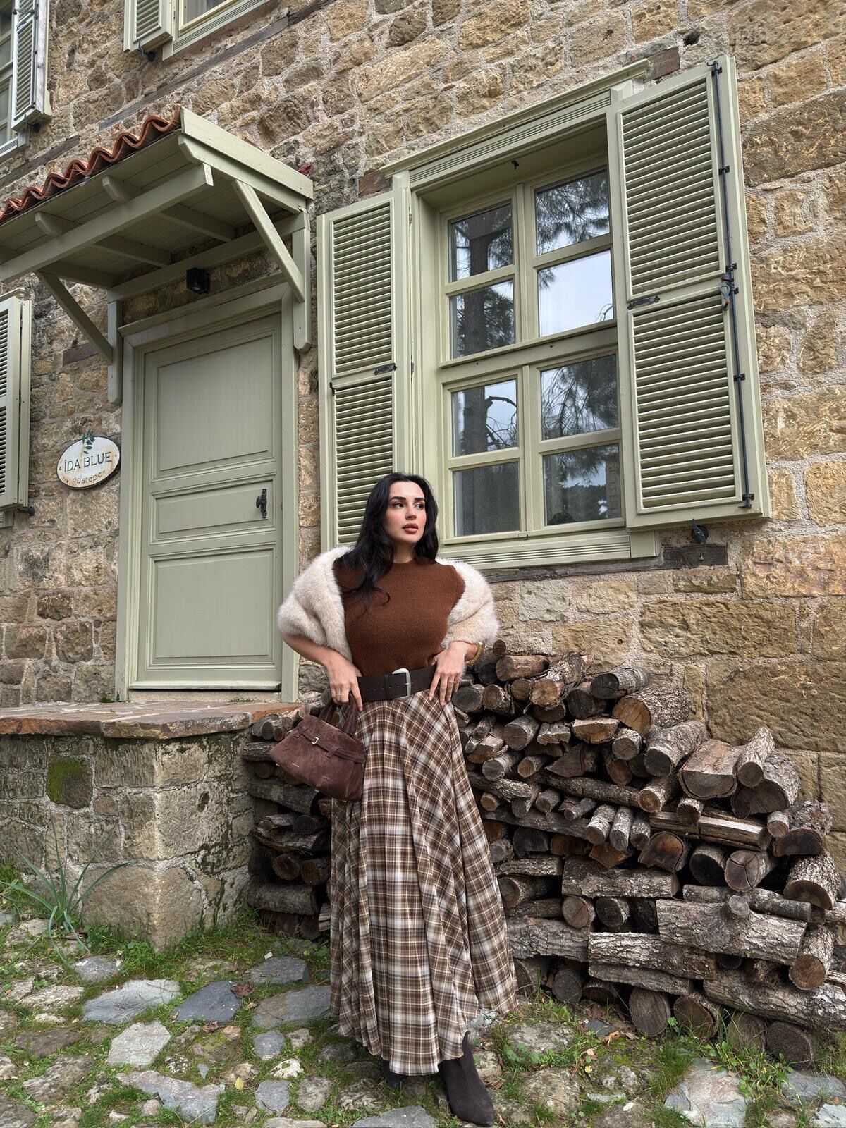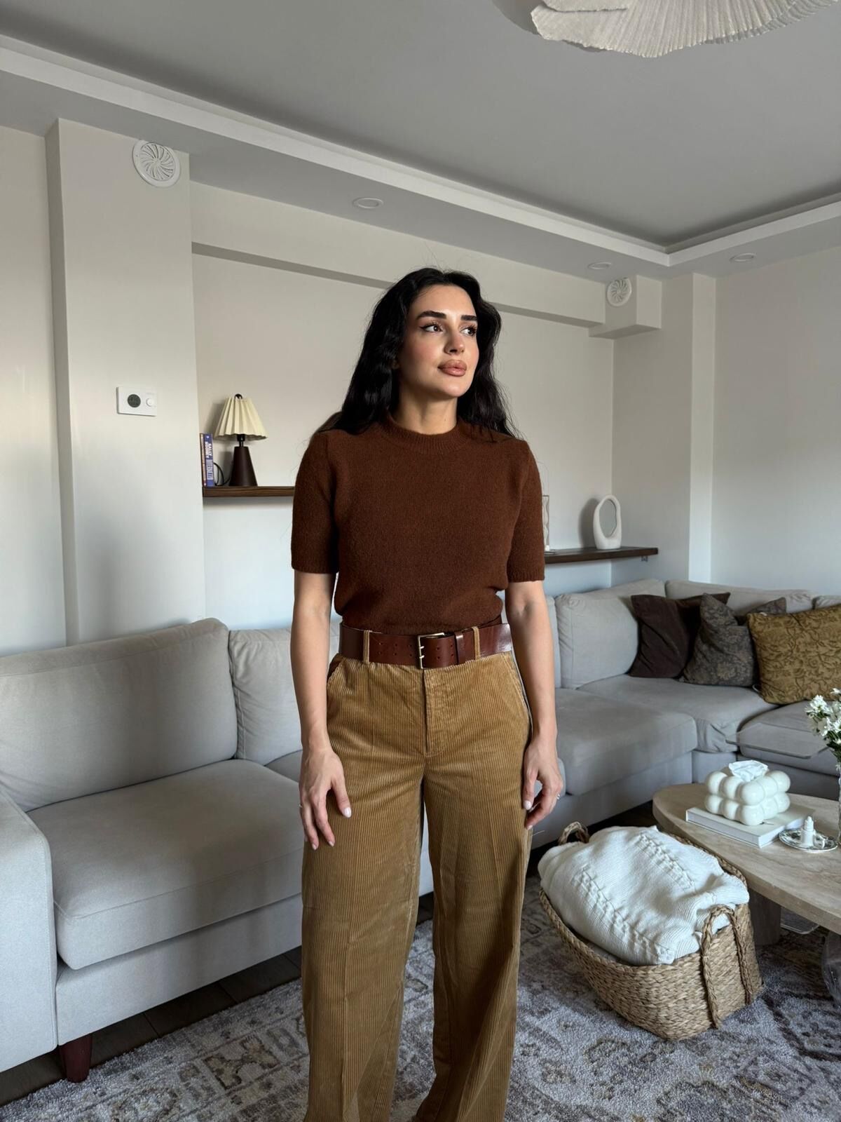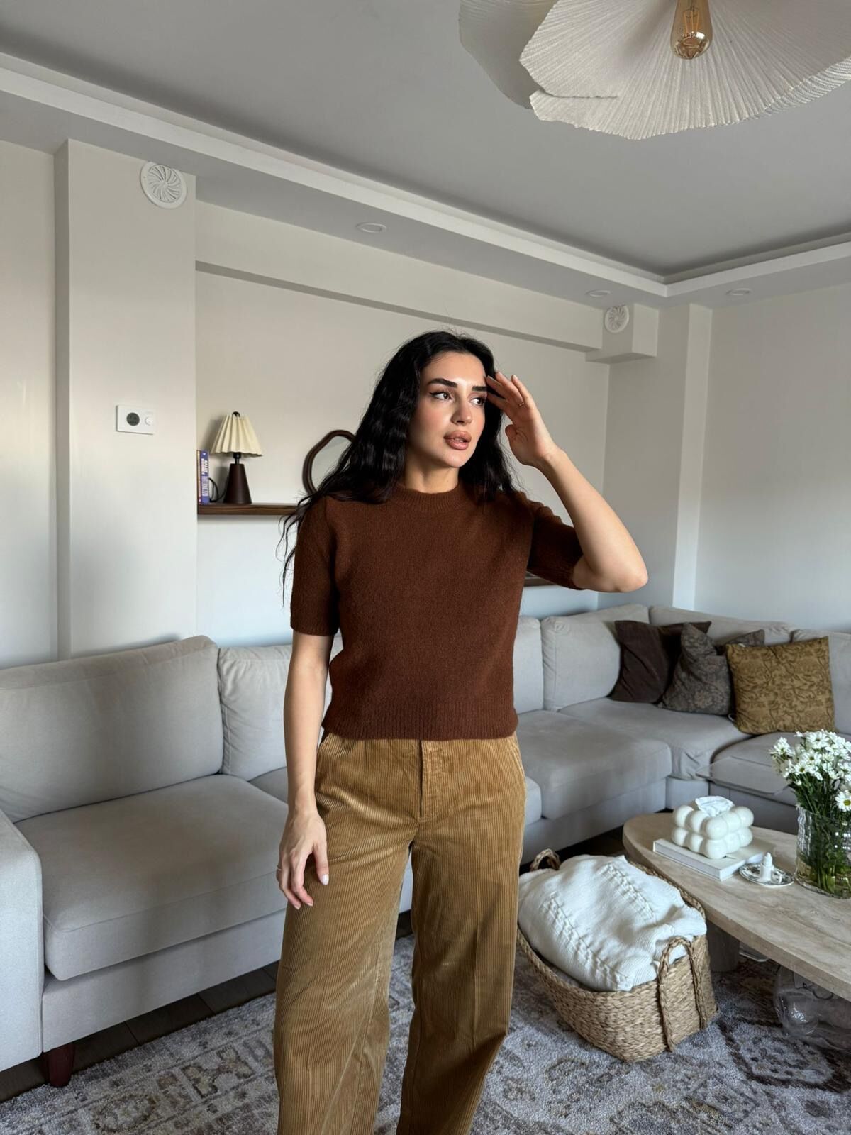 Kısa kollu bisiklet yaka triko bluz Kahverengi - STD