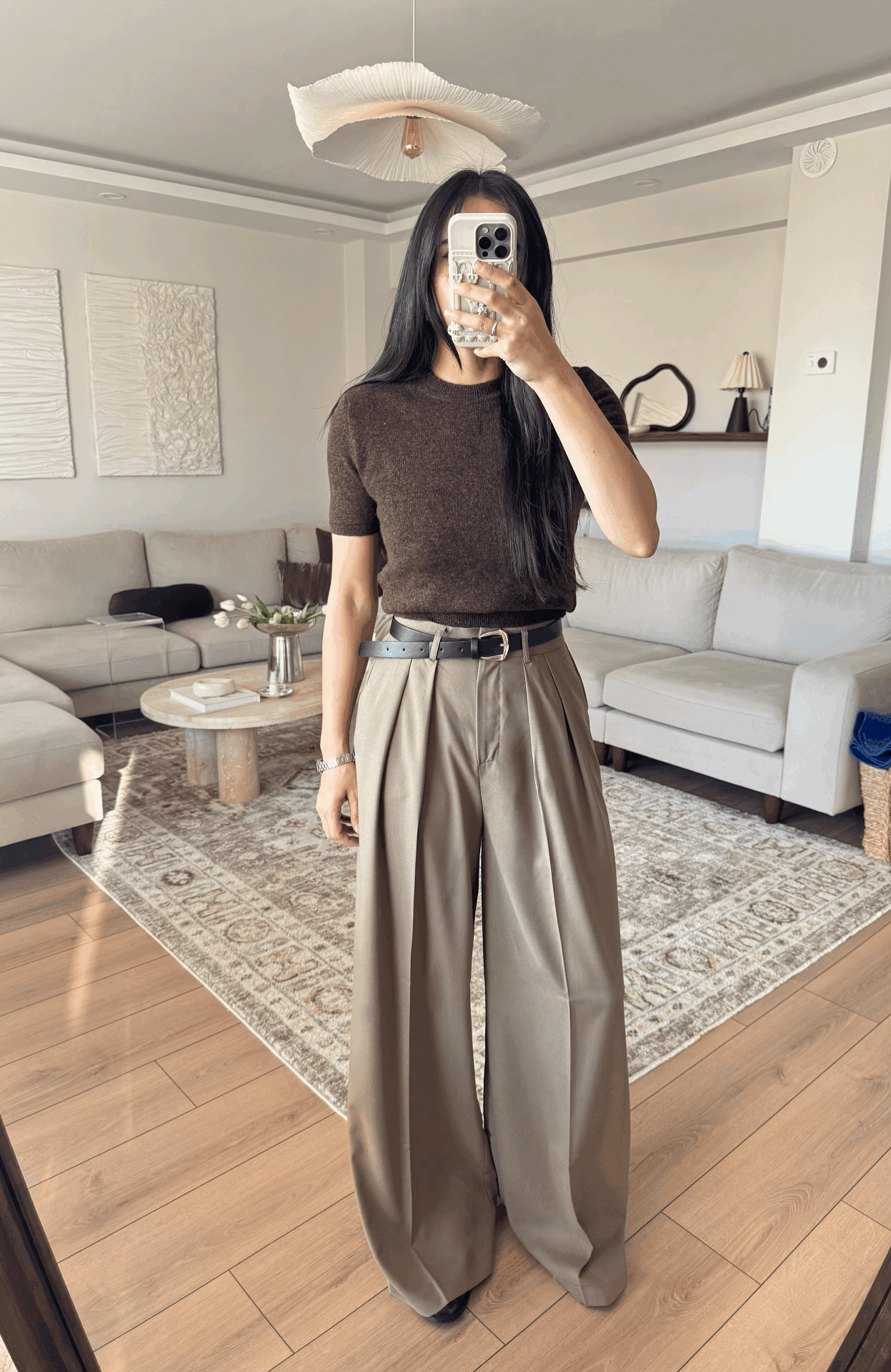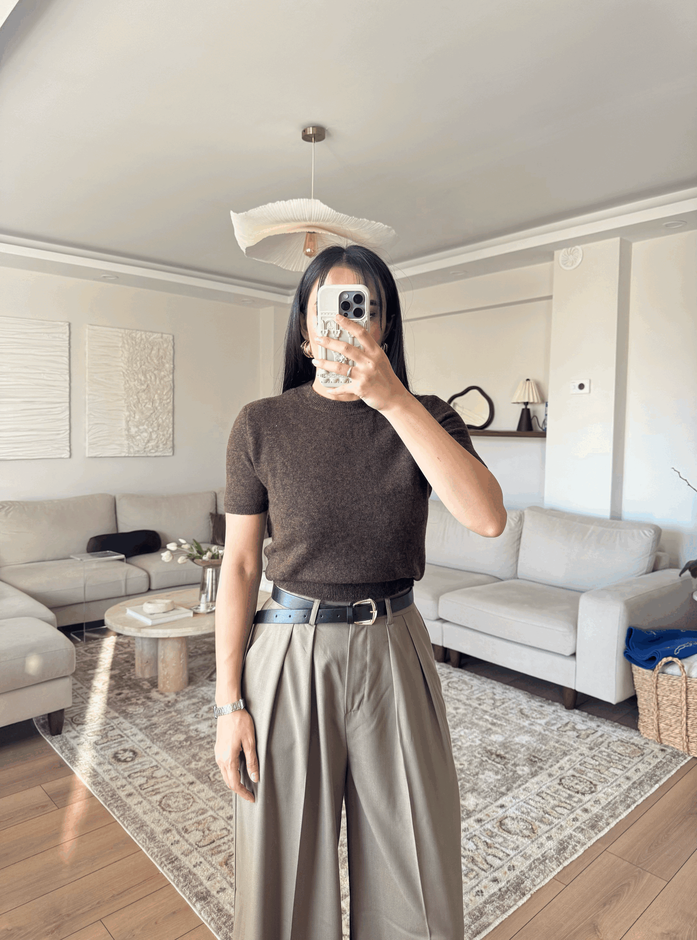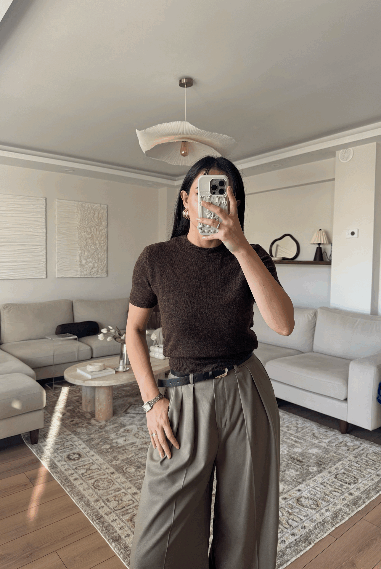 Yuvarlak yakalı, kısa kollu, bedene oturan kısa yumuşak triko kazak, Yakası, kol ağızları ve etek ucu lastik örgülü.