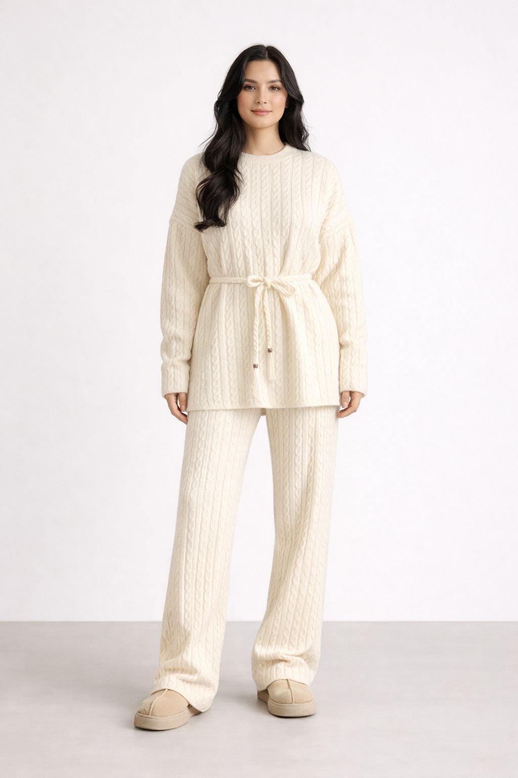 Kışın zarafetini konforla buluşturan Saç Örgü Kemerli İkili Takım, yumuşacık dokusu ve modern kesimiyle stilinize sıcak bir dokunuş katıyor.