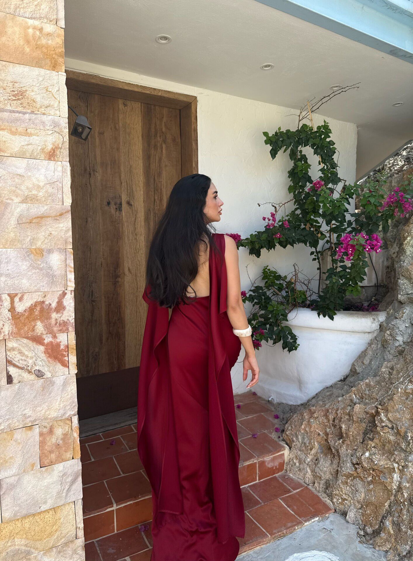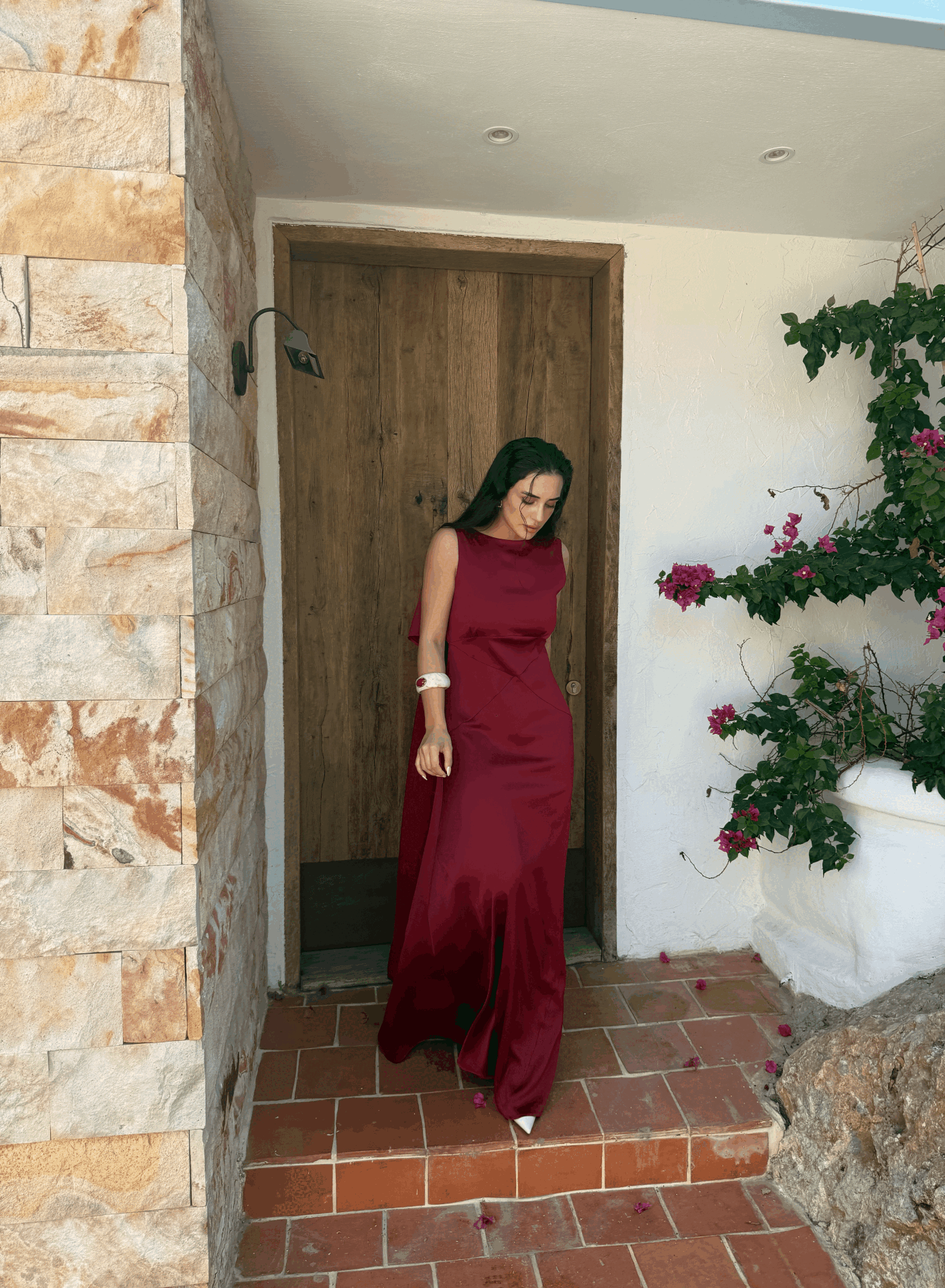 Sırt Dekolteli Saten Abiye Elbise Bordo - L
