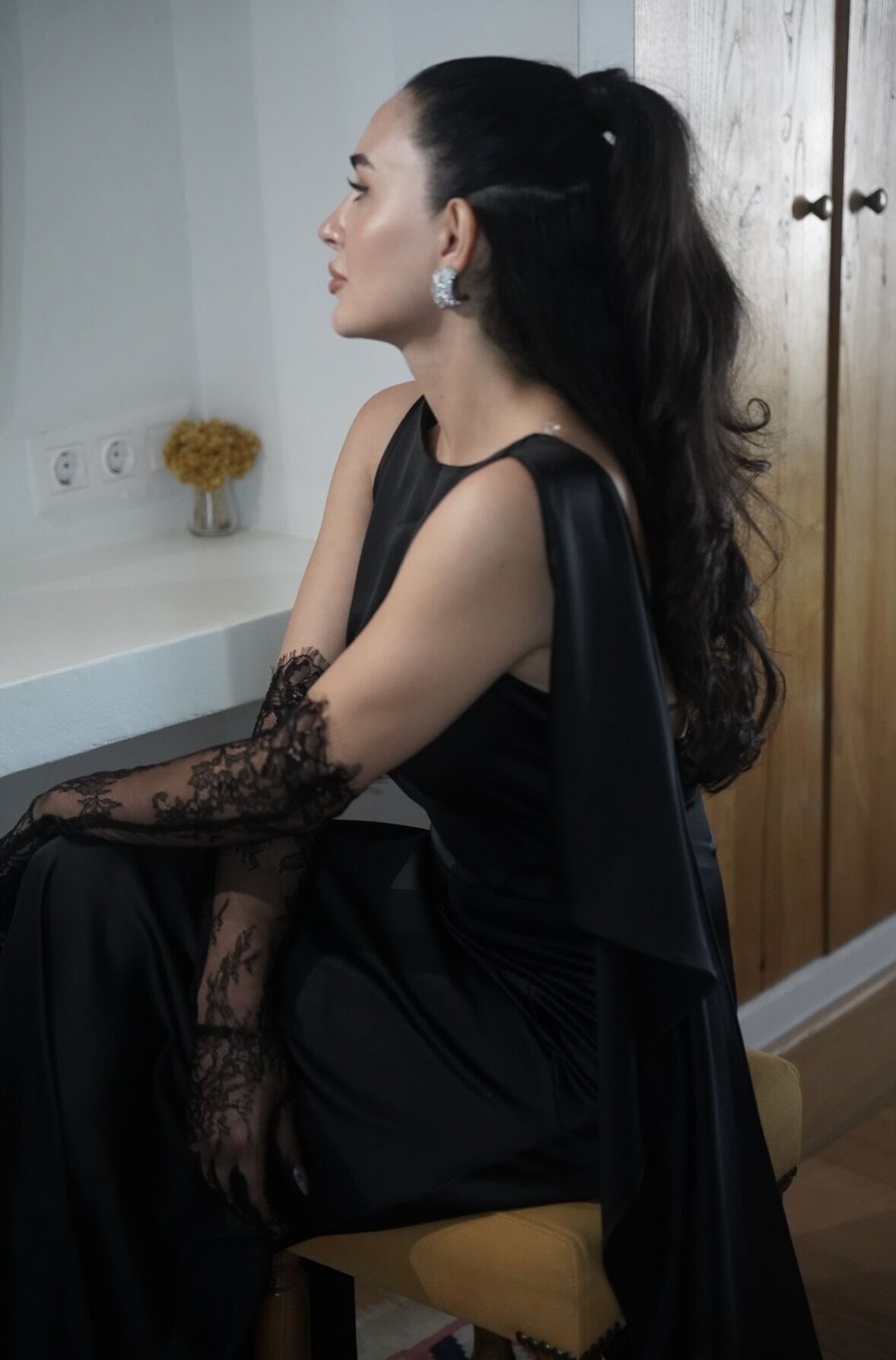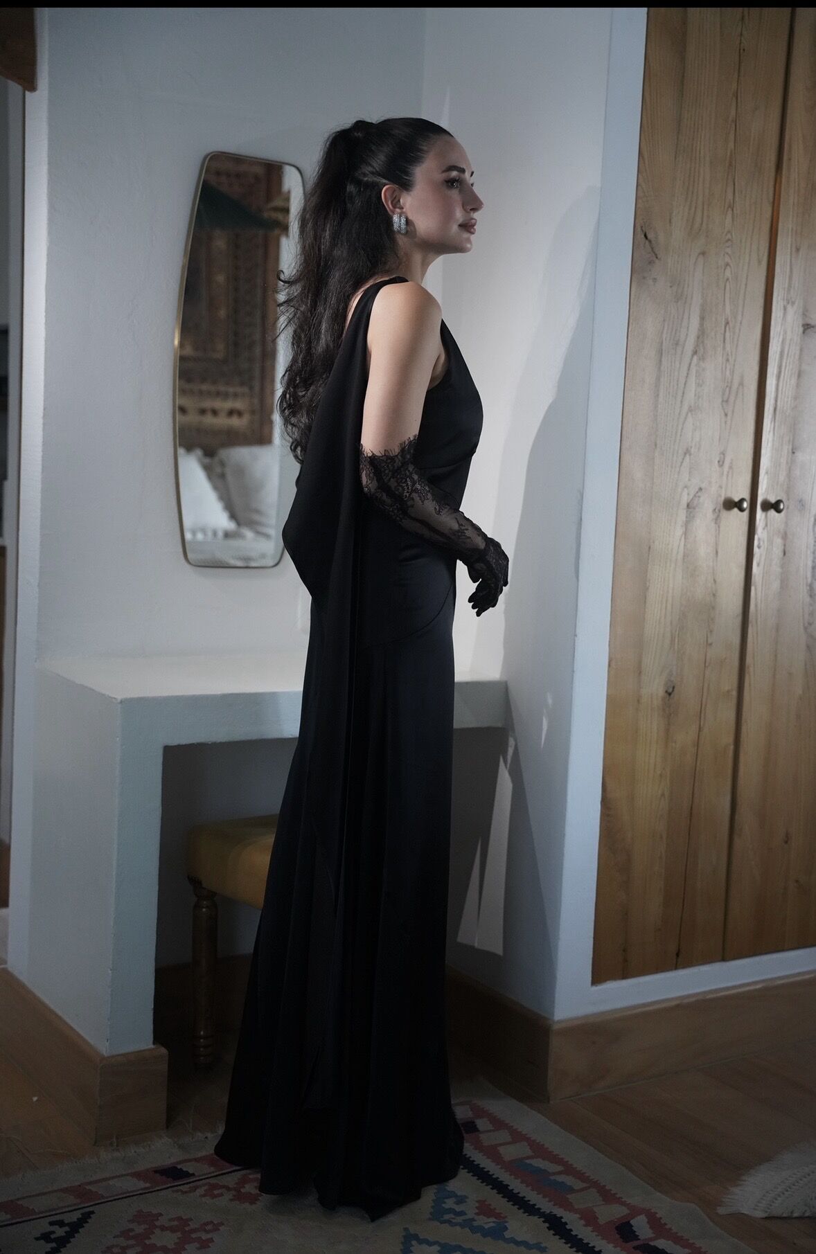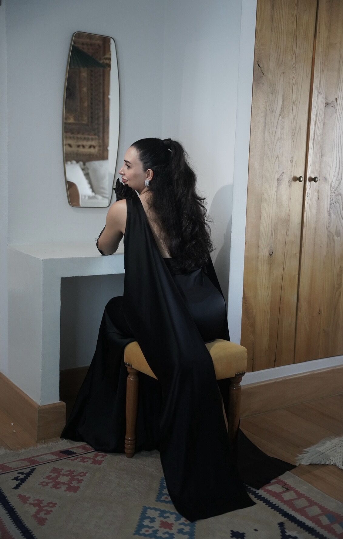 Sırt Dekolteli Saten Abiye Elbise Siyah - L