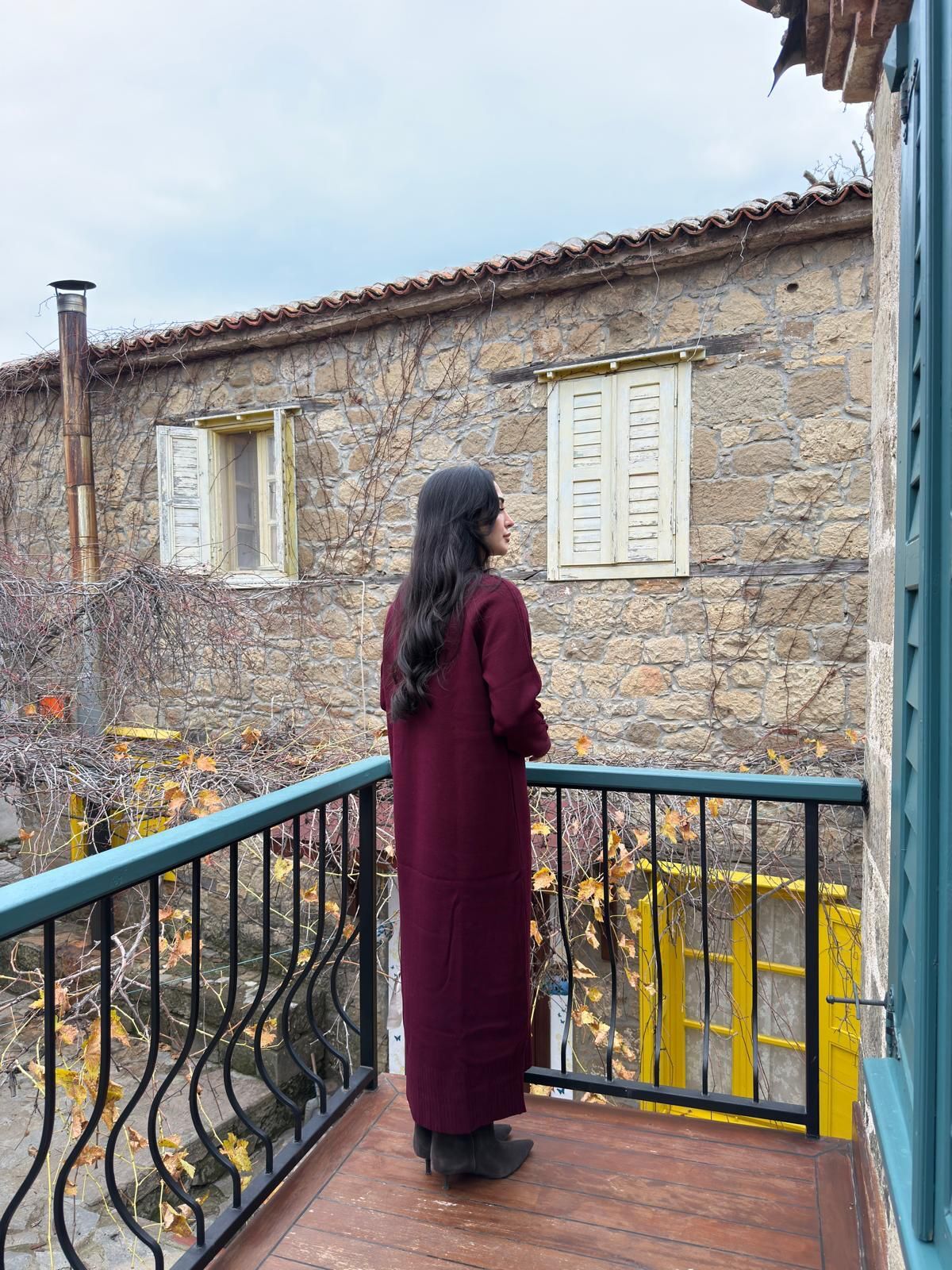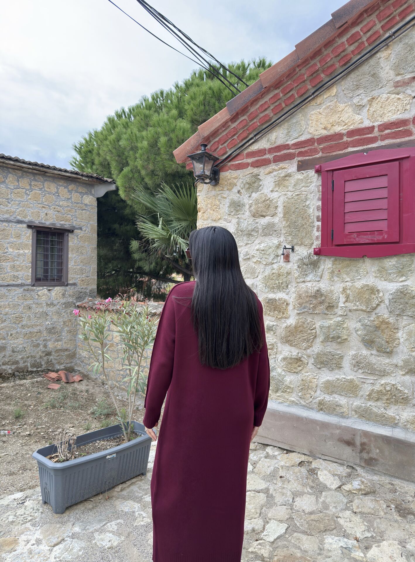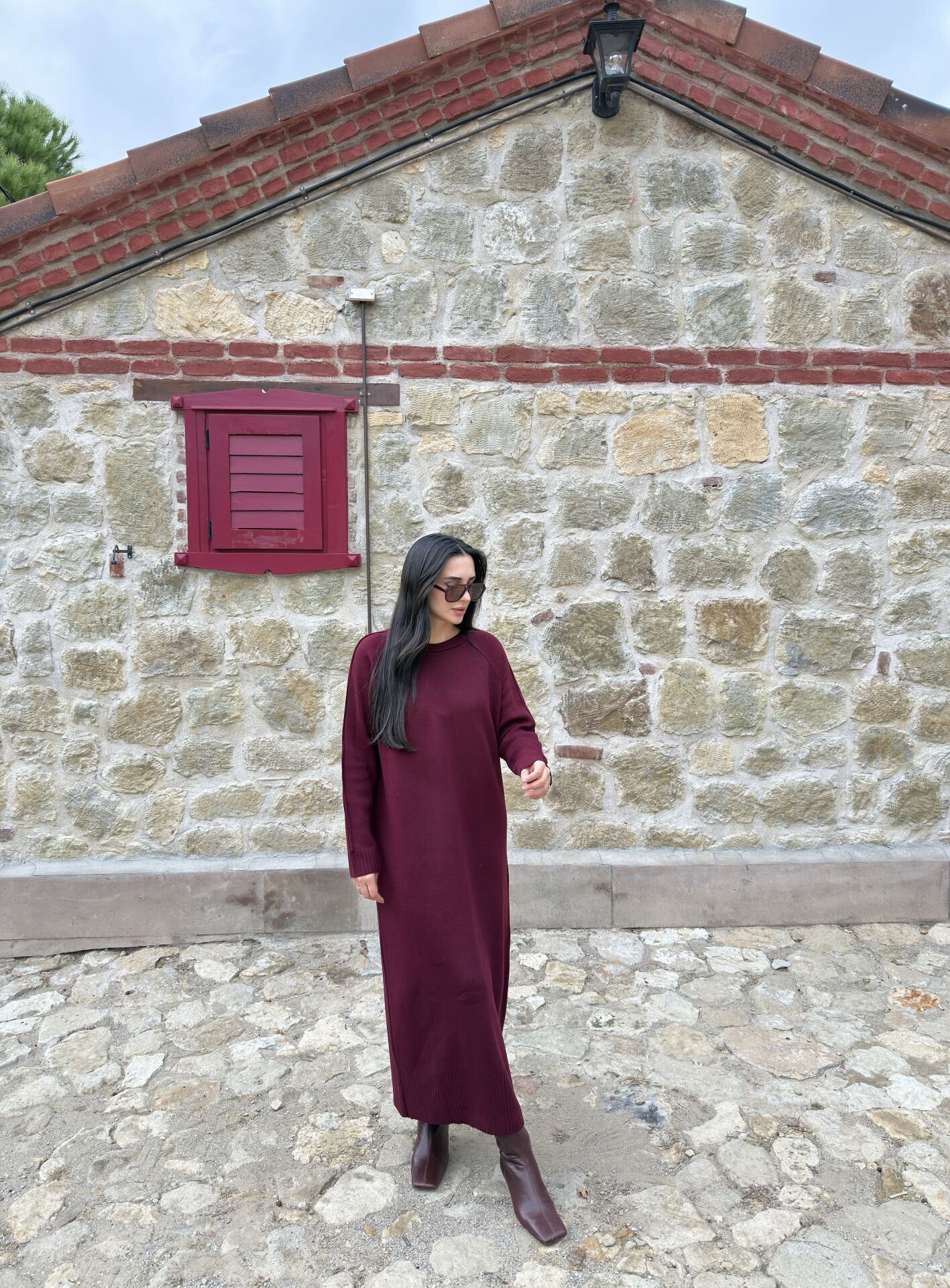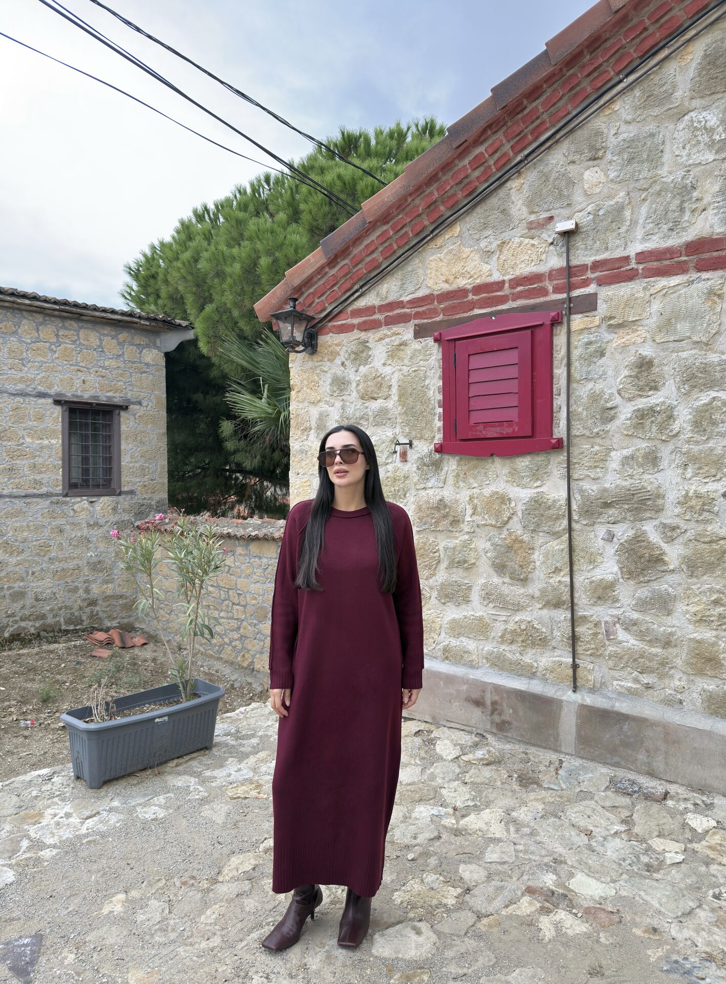 Derin bordo tonu ve uzun silüetiyle tek başına bile güçlü bir duruş yaratır.
