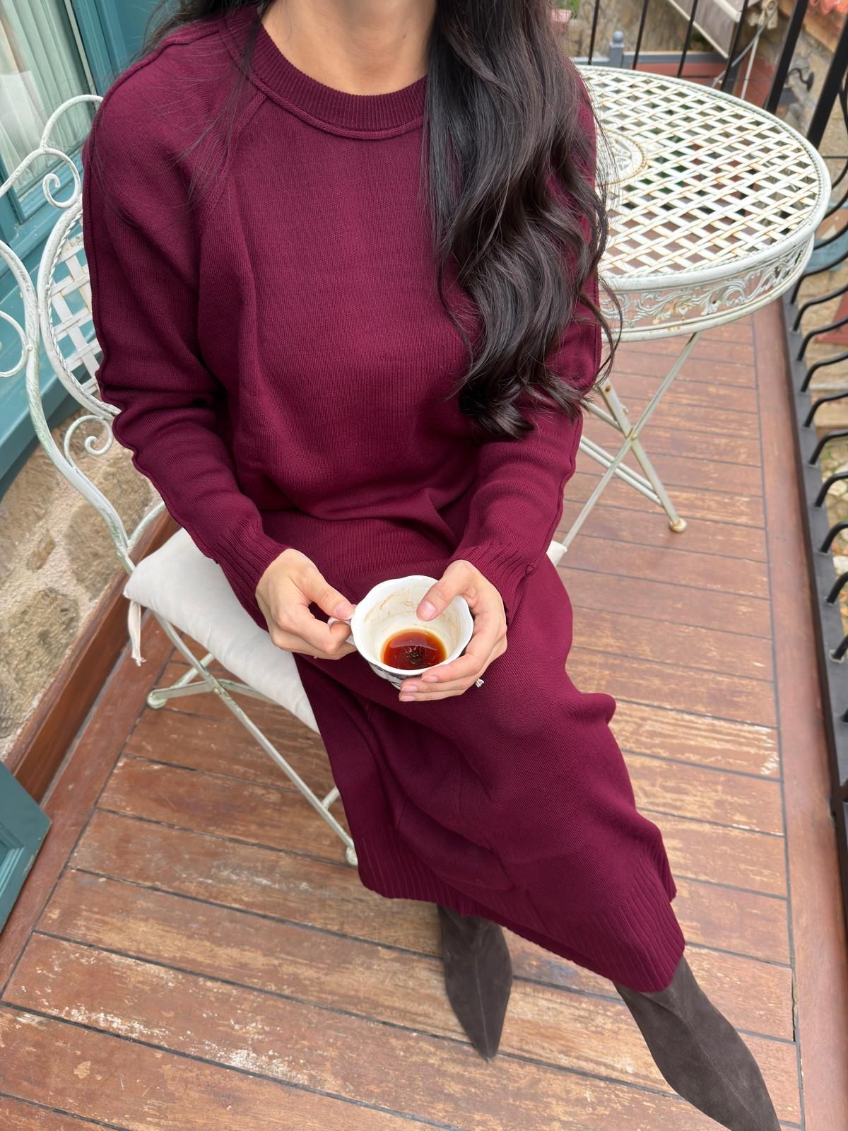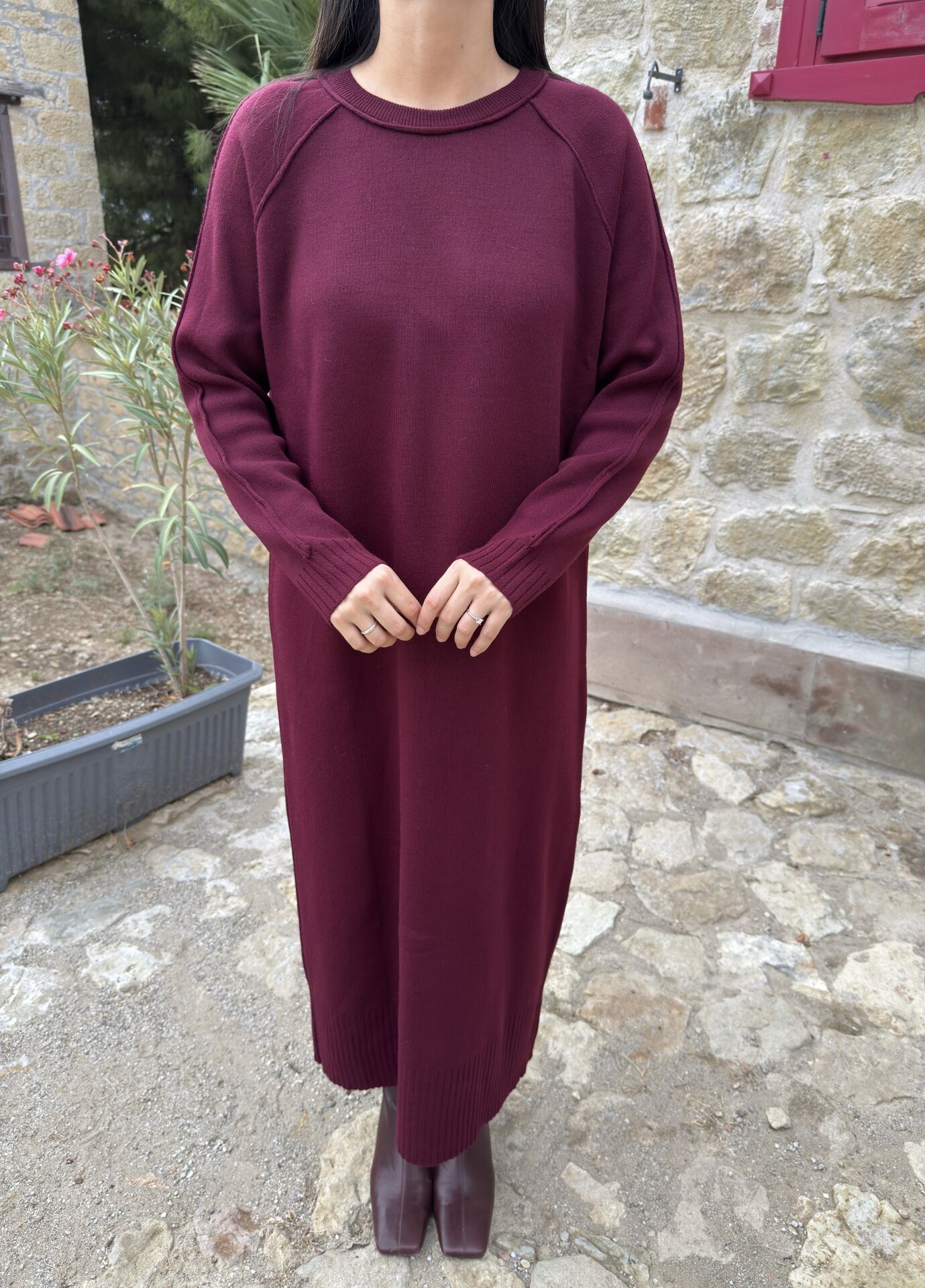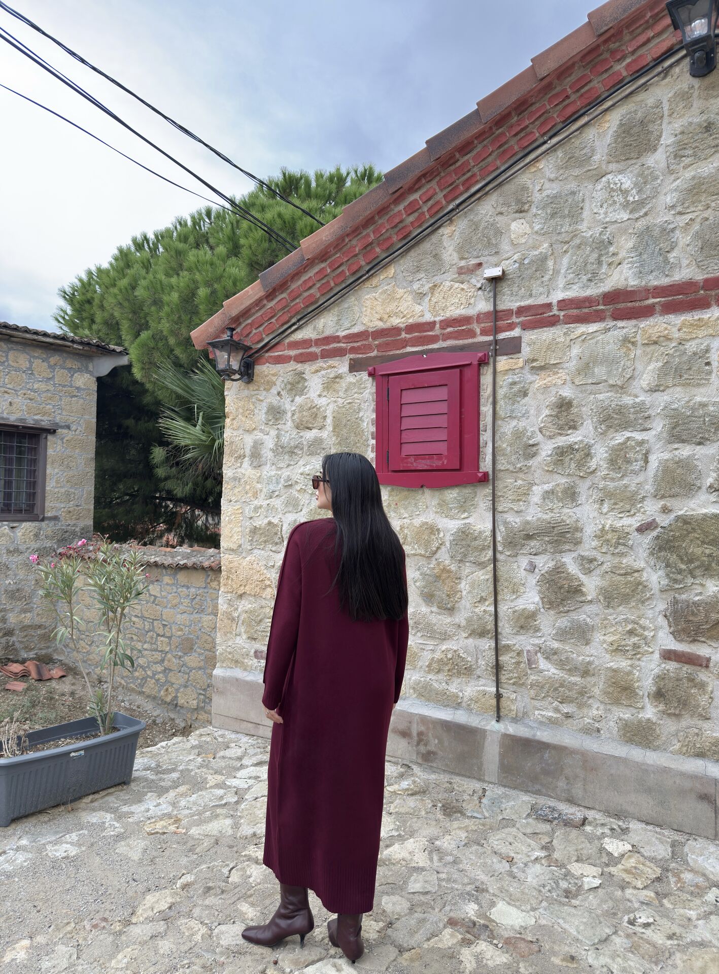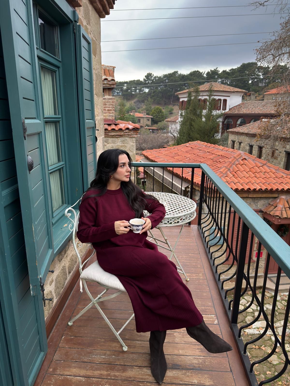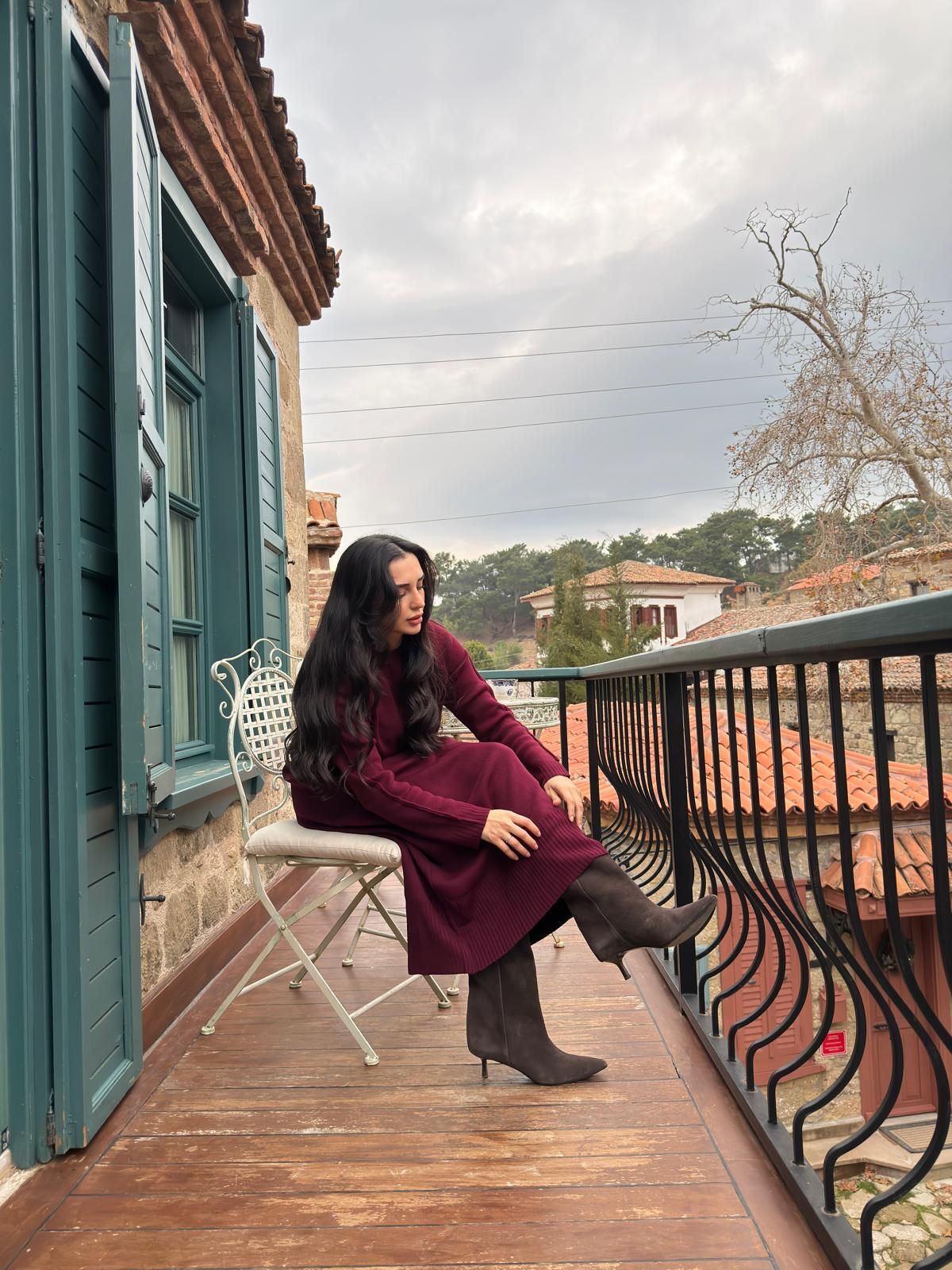 Derin bordo tonu ve uzun silüetiyle tek başına bile güçlü bir duruş yaratır.