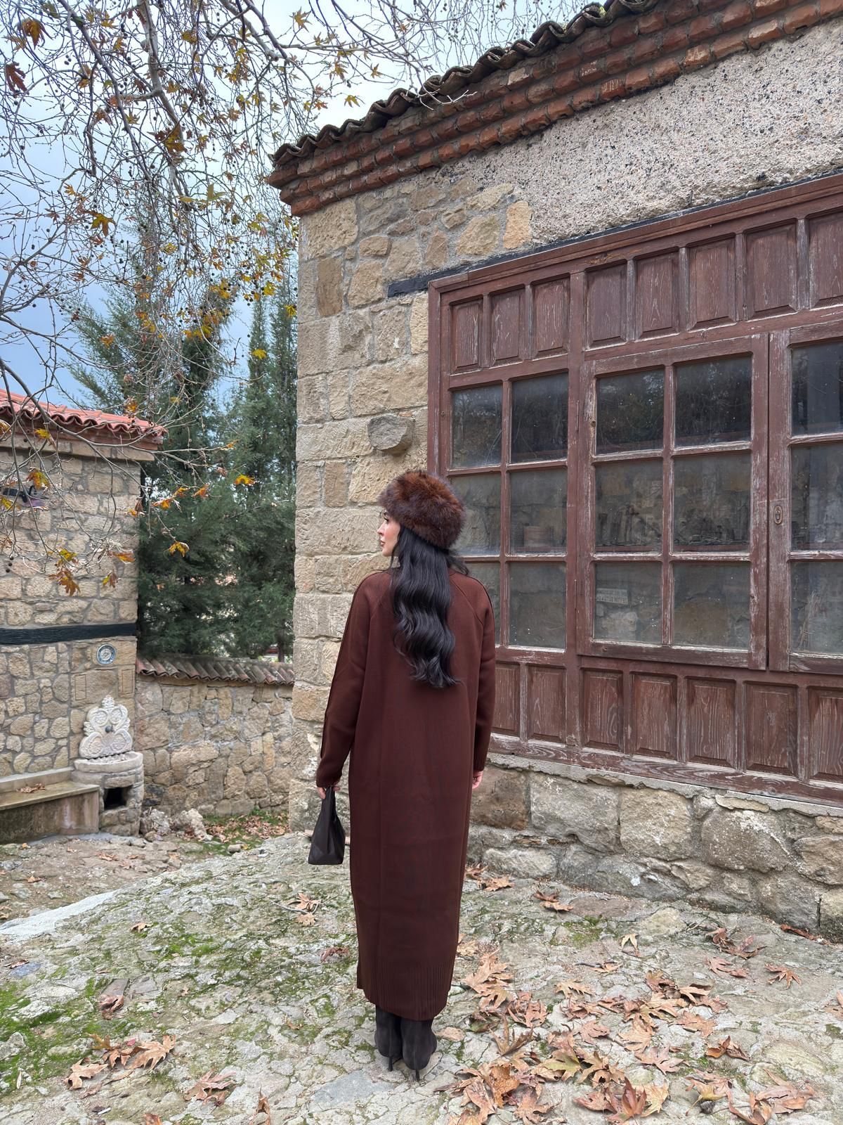 Derin bordo tonu ve uzun silüetiyle tek başına bile güçlü bir duruş yaratır.